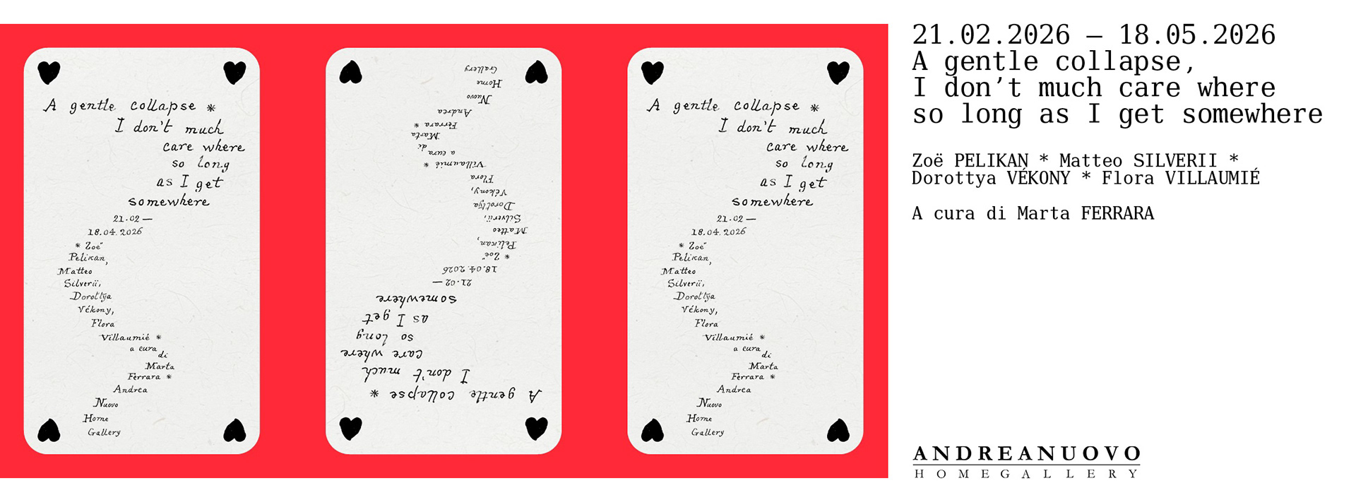 A Gentle Collapse is the moment when familiar structures gracefully crumble. A non-violent, almost elegant collapse that opens up new possibilities of meaning. The works inhabit this threshold: between control and loss, between logic and dream, between what we recognize and what destabilizes us. The reference to Alice is not stated in the title, but it runs through the entire project like an undercurrent: an invitation to lose oneself without panic, to accept inconsistency as part of the journey, to keep moving even when the direction is unclear.
